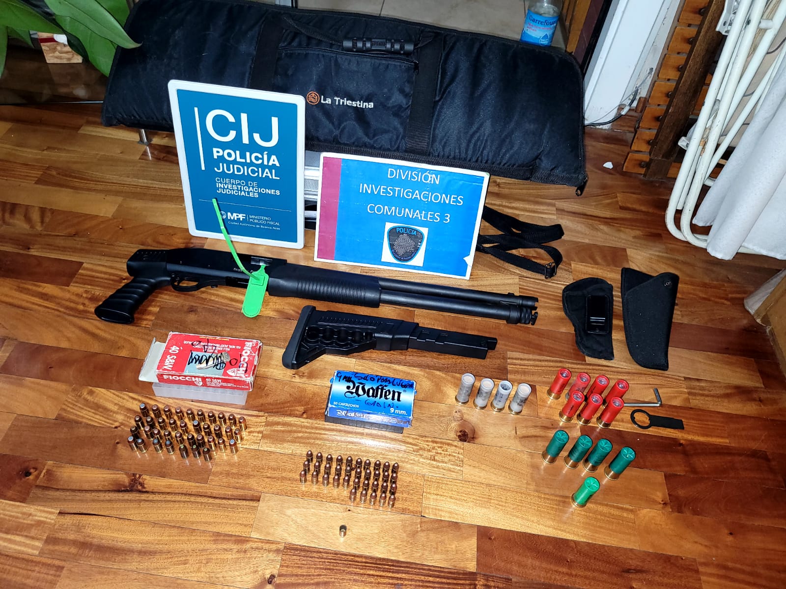 “En el allanamiento, realizado por personal de la División Investigaciones Comunales 3 de la Policía de la Ciudad junto al Cuerpo de Investigaciones Judiciales del Ministerio Público Fiscal de la Ciudad, se encontró el arma utilizada, una escopeta marca Akkar Silah calibre 12/76, 16 cartuchos calibre 40, 36 cartuchos calibre 9 mm, 2 tarjetas de consumo de municiones y una vaina servida”, sumaron.