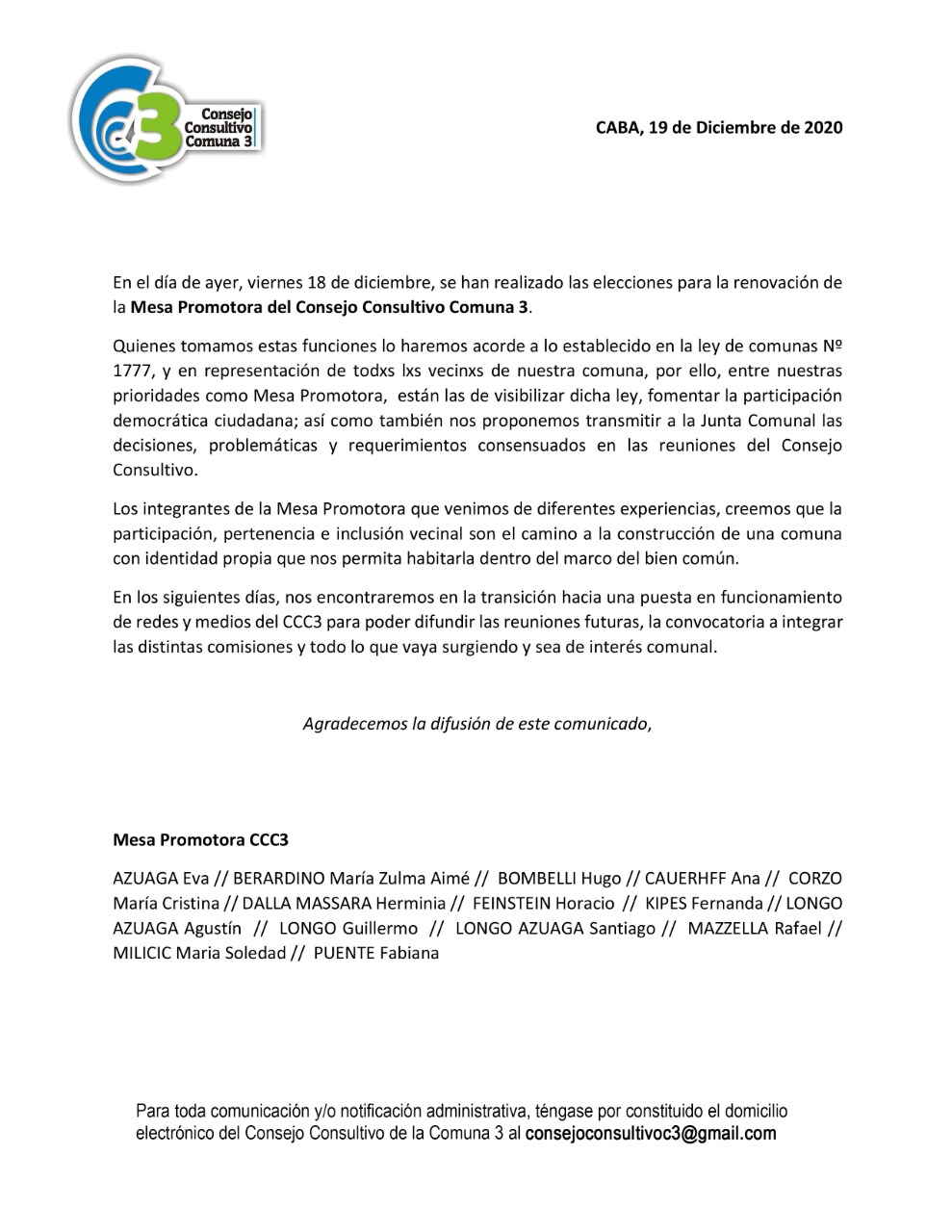 Este viernes 18 de diciembre desde las 18 se hizo la última reunión del año del Consejo Consultivo Comunal 3, donde participan vecinos de Balvanera y San Cristóbal. Se hizo de forma online.