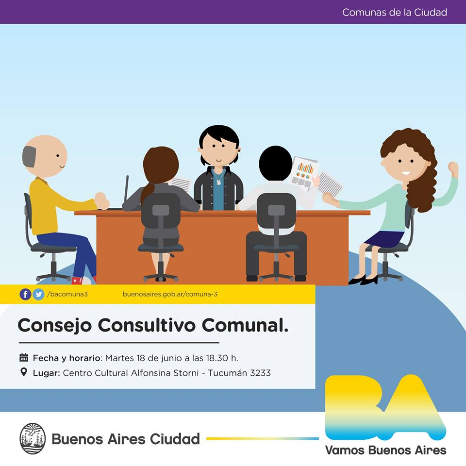 La próxima reunión del Consejo Consultivo Comunal 3 se realizará este martes 18 de junio a las 18:30 en el Centro Cultural Alfonsina Storni (Tucumán 3233). Asistirán vecinos de Balvanera y San Cristóbal para debatir sobre temáticas zonales.