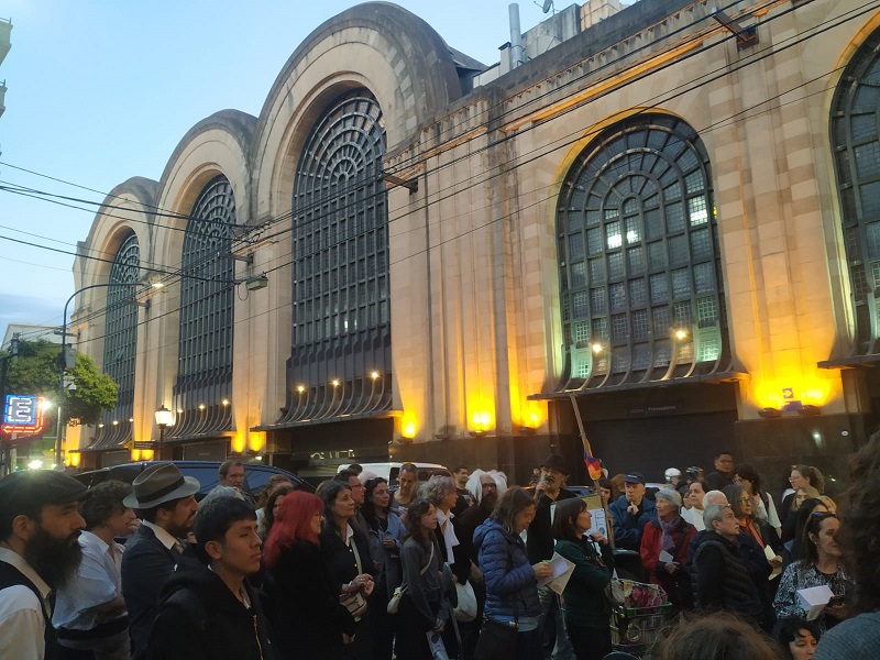 En Gallo y Guardia Vieja, integrantes del grupo Sin Telón, teatro comunitario del Abasto, interpretaron un fragmento de su obra El Mercado Olvidado, una creación colectiva de vecinos y actores que también rinde homenaje a los antiguos trabajadores del Mercado.