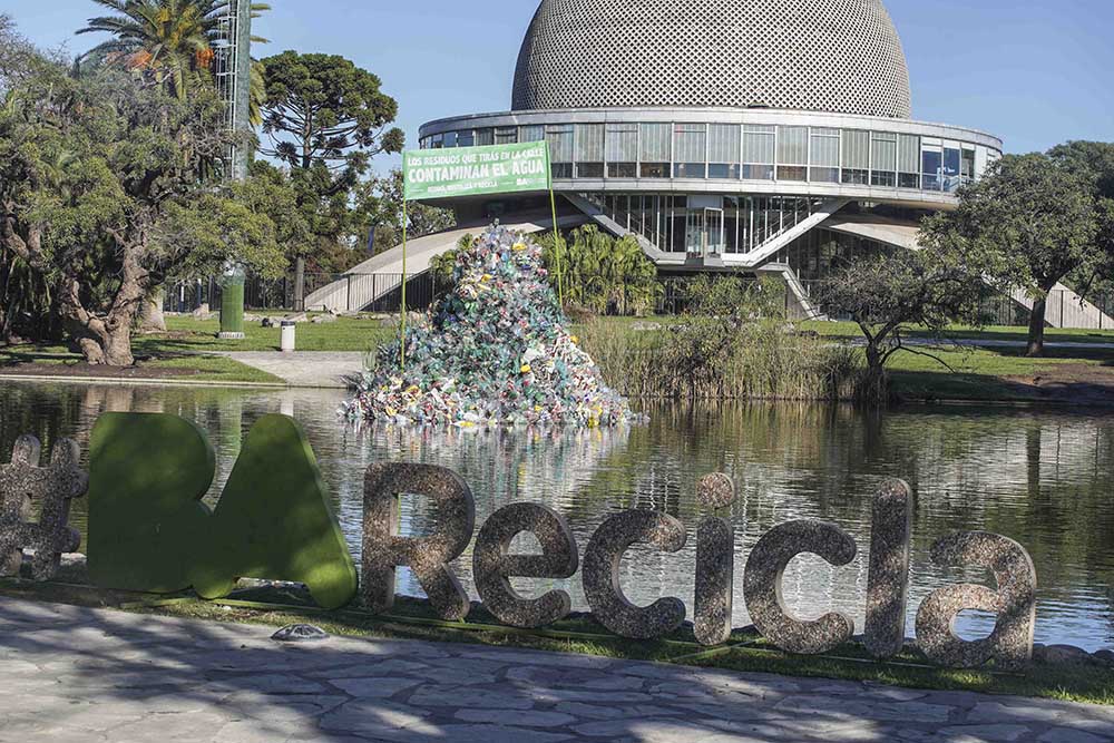 La isla de plásticos flotante fue instalada en el agua frente al Planetario: se trata de un montículo de residuos flotante, de más de 4 metros de alto, compuesto por botellas y otros materiales plásticos reciclables que representan los desechos que terminan en el Río de la Plata. Los plásticos utilizados para producir la isla fueron brindados por la cooperativa de recuperadores urbanos El Ceibo, cuya sede está muy cerca del lugar. Una vez que finalice la intervención, los materiales les serán devueltos para su respectivo procesamiento en el Centro Verde.