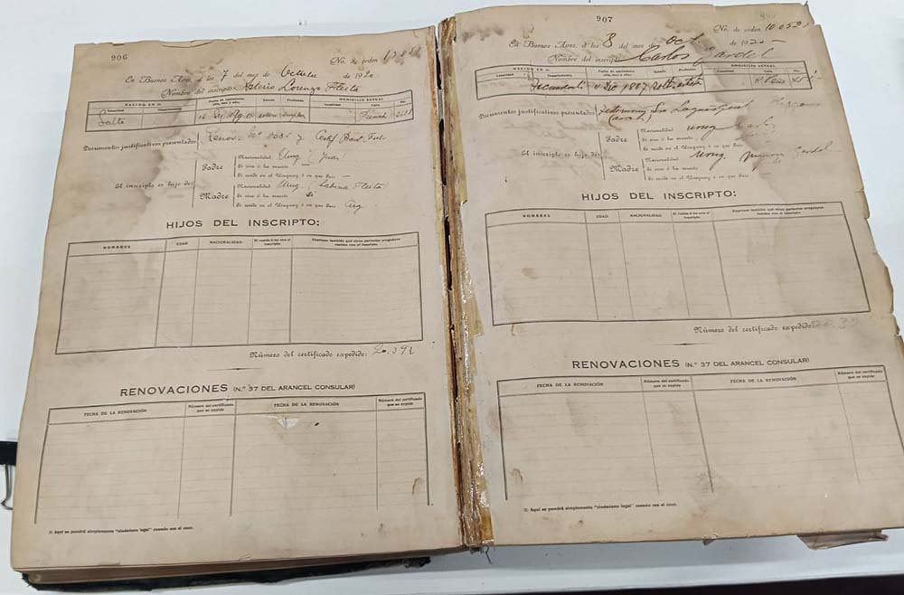 El documento corresponde a una inscripción realizada el 8 de octubre de 1920 en el Registro de Nacionalidad del Consulado del Uruguay en Buenos Aires. Allí, Gardel compareció voluntariamente y declaró haber nacido en Tacuarembó el 11 de diciembre de 1887. Se identificó como soltero, artista, con domicilio en Rodríguez Peña 451, y consignó como padres a Carlos y María Gardel, ambos uruguayos y fallecidos. La inscripción figura en el folio n.º 907 del Registro Civil del Uruguay, con certificado n.º 020.393.